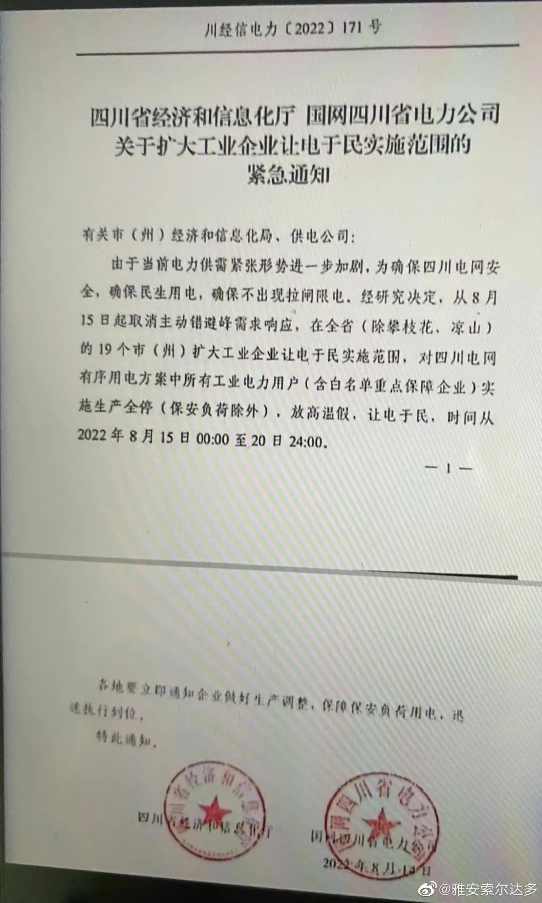 稍早,安徽、浙江、江蘇、四川等多地因高溫酷暑持續(xù)用電緊張,啟動(dòng)有序用電,要求工業(yè)企業(yè)錯(cuò)峰生產(chǎn)、保障民生用電,并發(fā)布節(jié)約用電倡議書(shū)。四川省經(jīng)濟(jì)和信息化廳和國(guó)網(wǎng)四川省電力公司聯(lián)合下發(fā)文件《關(guān)于擴(kuò)大工業(yè)企業(yè)讓電于民實(shí)施范圍的緊急通知》。通知表示,由于當(dāng)前電力供需緊張形勢(shì)進(jìn)一步加劇,為確保四川電網(wǎng)安全,確保民生用電,確保不出現(xiàn)拉閘限電。經(jīng)研究決定,從8月15日起取消主動(dòng)錯(cuò)避峰需求響應(yīng),在全省(除攀枝花、涼山)的19個(gè)市(州)擴(kuò)大工業(yè)企業(yè)讓電于民實(shí)施范圍,對(duì)四川電網(wǎng)有序用電方案中所有工業(yè)電力用戶(hù)(含白名單重點(diǎn)保障企業(yè))實(shí)施生產(chǎn)全停(保安負(fù)荷除外),放高溫假,讓電于民,時(shí)間從2022年8月15日00:00至20日24:00。各地要立即通知企業(yè)做好生產(chǎn)調(diào)整,保障保安負(fù)荷用電,迅速執(zhí)行到位。