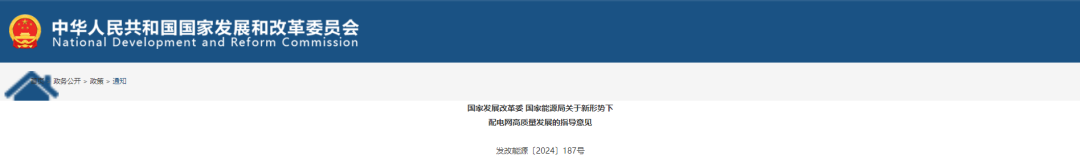 2024年2月6日,國(guó)家發(fā)展改革委、國(guó)家能源局聯(lián)合下發(fā)《關(guān)于新形勢(shì)下配電網(wǎng)高質(zhì)量發(fā)展的指導(dǎo)意見》(發(fā)改能源〔2024〕187號(hào)),文件提出: