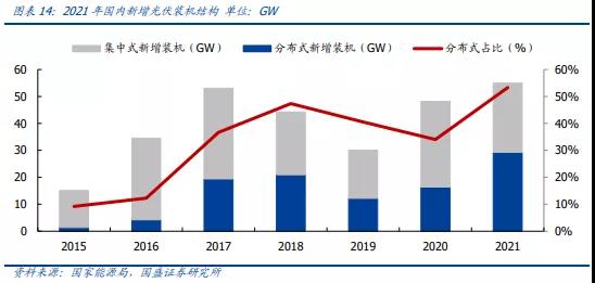 “十四五”首年,光伏發(fā)電建設(shè)實現(xiàn)新突破,呈現(xiàn)新特點。據(jù)國家能源局數(shù)據(jù),2021年,我國新增光伏裝機54.93GW,同比增長14%,連續(xù)9年穩(wěn)居世界首位。其中,新增分布式裝機約29.28GW,占新增光伏裝機的53%,歷史上首次突破50%,占據(jù)光伏市場的半壁江山的分布式光伏是大勢所趨。
