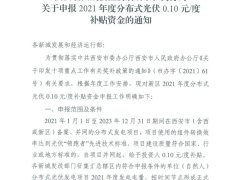 7月7日,陜西省西安市西咸新區(qū)發(fā)展改革和商務(wù)局關(guān)于申報2021年度分布式光伏0.1元度補貼資金的通知,明確2021年1月1日至2023年12月31日期間在西...