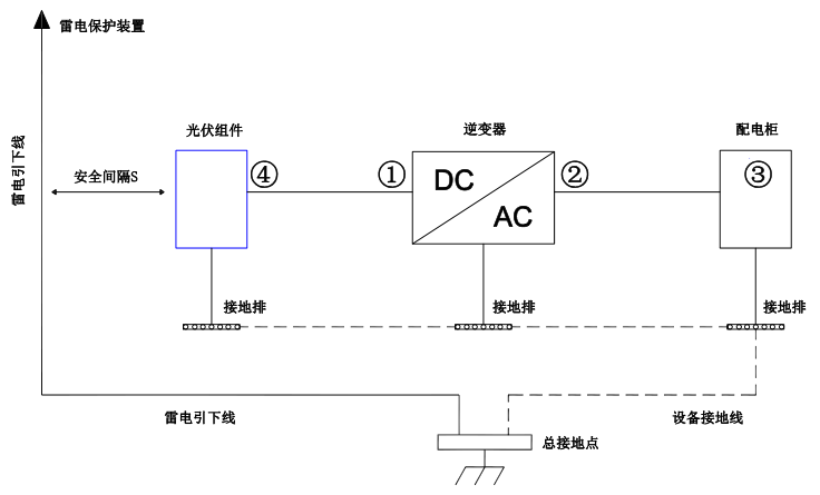 2、雷電保護(hù)裝置及引下線與光伏系統(tǒng)中相關(guān)設(shè)備(包含光伏面板、逆變器、電纜、配電設(shè)備)應(yīng)保持安全間隔距離S。S的建議值:按一般5層樓高(約15m)建筑屋頂,S取2.5m足夠,此距離可按樓層高度反比關(guān)系簡化計算。